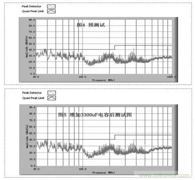 現(xiàn)場測試時,在模塊電源VH2處增加一個3300uf的電解電容,發(fā)現(xiàn)對輻射的抑制作用明顯,特別是在30MHz至1000MHz區(qū)間對毛刺和能量頻譜的抑制作用明顯(見圖4和圖5)。電容值越大,對毛刺尖峰的抑制作用越明顯,濾波后的曲線越平滑。當然,電容值的選擇需要按照實際的設計要求來定。