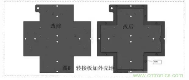 當LED面陣驅(qū)動板增加兩層接地,由原先的4層板變成6層板,能起到較好防止輻射的作用。當轉(zhuǎn)接板周邊附整邊銅箔,并與金屬箱體用螺釘緊固,形成外殼地,從而達到對信號起到屏蔽作用(圖6)。
