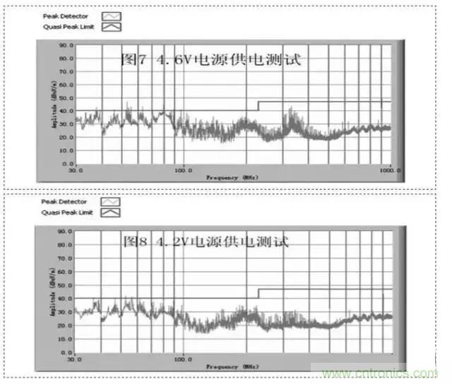 因為傳導、輻射的數(shù)值與dv/dt 或者 di/dt成正比,所以電壓越高,傳導、輻射的數(shù)值越大。樣品的供電電壓是4.6V,當電壓調(diào)整供為4.2V后,從實驗數(shù)據(jù)可以看出,發(fā)現(xiàn)尖峰毛刺也能得到一定改善(圖7、圖8)。