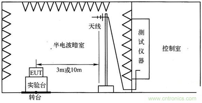 圖1所示是根據CISPR16、CISPR11、CISPR13、CISPR15、CISPR22及EN55022等標準要求的輻射發射測試布置圖,輻射發射測試時,被測設備(EUT)置于半電波暗室內部,在轉臺上旋轉,在接收天線分別處于垂直極化和水平極化的情況下,找到最大的輻射點。輻射信號由接收天線接收后,通過電纜傳到半電波暗室外的接收機。