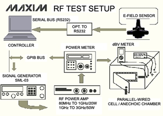 Maxim的RF測(cè)試裝置(圖2)產(chǎn)生用于測(cè)試RF抗干擾能力的RF場(chǎng)。測(cè)試電波暗室具有一個(gè)屏蔽室,作用與法拉第腔的屏蔽室類似,具有連接電源和輸出監(jiān)視器的端口。把下面列舉的設(shè)備連接起來就可以組成測(cè)試裝置: