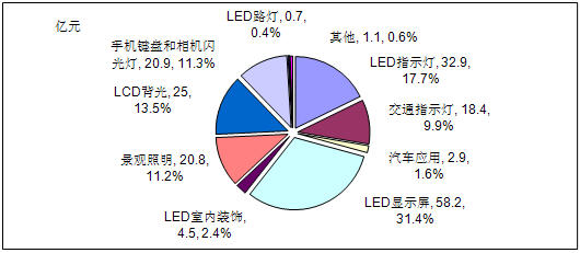- LED顯示屏、LED指示燈、LCD背光以、手機鍵盤和相機閃光燈四大應用領域市場需求額占整體市場的73.9%