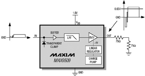 當視頻濾波放大器采用1.8V電源電壓工作時,必須采用DirectDrive技術。采用電壓模式輸出級的放大器必須至少提供2VP-P擺幅,才能輸出復合視頻信號。傳統的放大器采用1.8V單電源供電時,沒有足夠的余量產生2VP-P輸出信號。而采用DirectDrive后,集成反向電荷泵將產生一個嘈雜的-1.8V電壓;負電壓線性穩壓器將-1.8V電壓穩定到-1V,降低了電荷泵噪聲。因此,實際采用-1V~+1.8V的電壓供電時,MAX9509剛好有足夠的余量輸出2VP-P視頻信號。