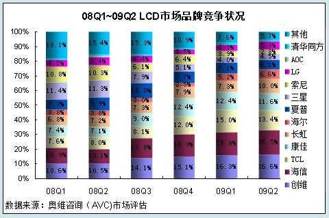 T6陣營(TCL、創維、海爾、海信、長虹、康佳)在2008年,借助“奧運攻勢”等活動發力,并通過產品線的不斷更新定義,終端渠道的投入及價格戰等逐步確立主導地位。但由于受面板價格上升及缺貨的影響,2009年二季度國內品牌市場地位容易下滑,S3(三星、索尼、夏普)挾技術及面板資源攻守兼備,同時LG、冠捷、清華同方品牌也正發力提升LCD電視市場銷售,市場競爭愈加激烈。