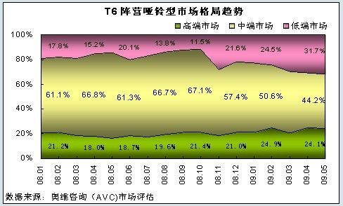 隨著彩電市場產品技術、功能的進一步演化,以及不同地區、不同人群需求的多樣化,中國彩電市場向高端和低端二個市場分化趨勢更加明顯:趨優市場,高端消費群體更樂意花更多的錢買高品質、高價值、多功能且充滿感情色彩的產品和服務;趨低市場,低端消費群體更在意能用相對低廉的價格購買可滿足針對性需求的高性價比產品和服務,平板電視的啞鈴型市場格局也正逐步呈現出趨勢。