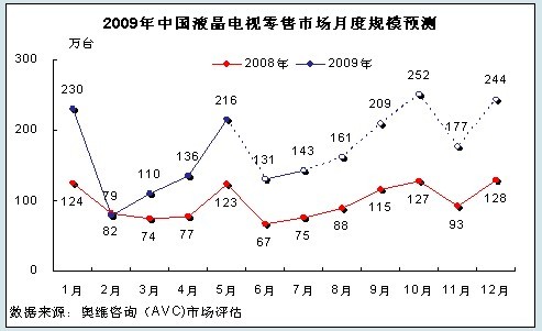 受上半年經濟形勢低迷以及產品替代影響,即使在家電下鄉、節能補貼、以舊換新三大政策刺激下,2009年全年彩電市場零售量規模將較2008年下降6.5%。但對于液晶電視來說,則得益于三大政策的刺激,繼續保持高速增長,預計全年LCD電視市場國內零售量規模近2100萬臺,出貨規模可達2400萬臺,LCD電視市場將占總體市場比達到62.6%。