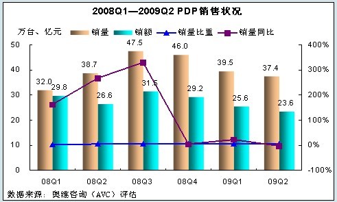 - 2009年上半年等離子電視銷售56.7萬臺,42.1億元,市場份額分別為14.4%和14.5%