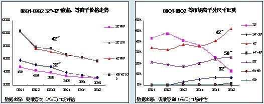 在以上雙重因素的作用下,等離子市場32、42和50英寸產(chǎn)品三足鼎立的局勢被打破,出現(xiàn)了42英寸占據(jù)半壁江山的局面。據(jù)奧維咨詢(AVC)數(shù)據(jù)顯示:32英寸產(chǎn)品比重已由08Q1的43.4%跌至09Q2的13.0%,而42英寸產(chǎn)品則由34.7%攀升至52.4%。