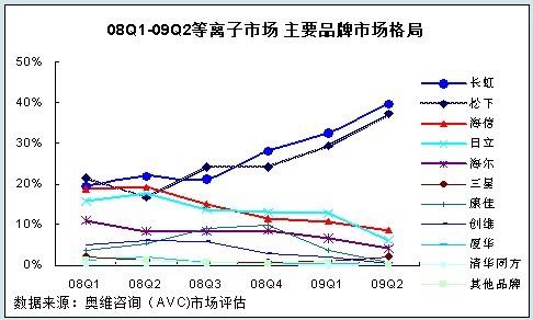 - 2009年上半年等離子市場長虹、松下市場占有率分別達35.4%、32.4%,二者合計達到67.8%