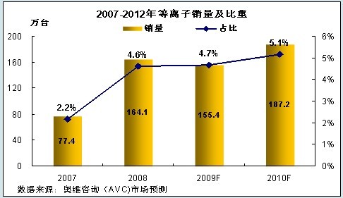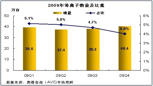 考慮到未來平板電視市場的走勢、結合等離子上下游產(chǎn)業(yè)情況,奧維咨詢(AVC)預測:2009年全年等離子銷量為155.4萬臺,與2008年的總量基本持平。2009年下半年,受液晶市場的規(guī)模優(yōu)勢擠壓,第三、四季度等離子電視的銷量因彩電旺季到來將上升至78.6萬臺,但占市場比重將下降至4.3%。