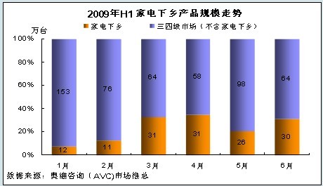 根據(jù)奧維咨詢(AVC)對家電下鄉(xiāng)市場的監(jiān)測以及對全國市場零售規(guī)模的評估,2009年1-6月份彩電下鄉(xiāng)零售規(guī)模為141.09萬臺,占三四級市場的總量的21.54%。