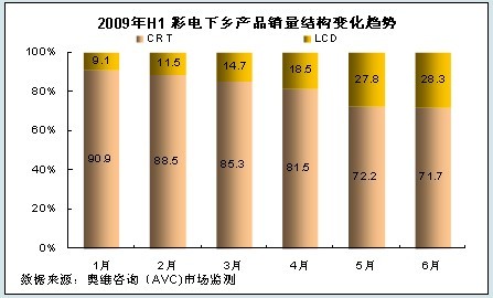 隨著LCD電視產(chǎn)品價格的不斷下降,在城市市場LCD電視對CRT電視的替代率在不斷增加,目前CRT電視在城市市場已經(jīng)處于一個補充的從屬地位,農(nóng)村市場已經(jīng)成為CRT產(chǎn)品銷售的主要市場。從彩電下鄉(xiāng)的銷售數(shù)據(jù)來看,2009年上半年CRT銷售占家電下鄉(xiāng)銷售總量的79.94%,仍占據(jù)彩電下鄉(xiāng)的主導地位;從銷售比重的走勢看,LCD正不斷侵蝕CRT的市場,其中尤以4、5月份侵蝕速度最快。
