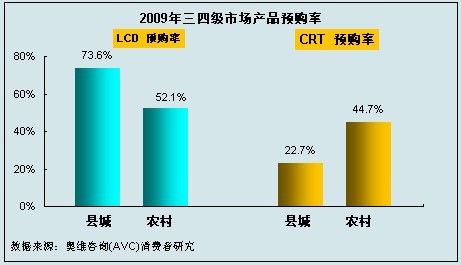 奧維咨詢(AVC)對主要下鄉(xiāng)省份的三四級市場研究結(jié)果顯示,在有計劃于2009年購買彩電產(chǎn)品的人群中,他們更傾向于購買LCD產(chǎn)品,;而即使在農(nóng)村市場,CRT產(chǎn)品的預購率仍要低于LCD產(chǎn)品,扣除消費者購買能力因素,LCD在農(nóng)村市場的被接受程度仍然較高。