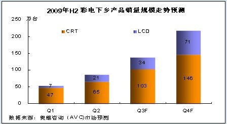 根據(jù)奧維咨詢(AVC)對三四級以及農(nóng)村市場的理解和研究,結(jié)合下半年彩電業(yè)形勢,我們認為:隨著各省對家電下鄉(xiāng)工作的進一步開展以及彩電市場傳統(tǒng)旺季的到來,2009年第三、四季度,彩電下鄉(xiāng)規(guī)模將繼續(xù)保持較快速度增長,同時LCD產(chǎn)品的比重也將進一步增加,到第四季度,LCD產(chǎn)品銷量比重將占彩電下鄉(xiāng)市場的三分之一,銷售額比重將突破50%。