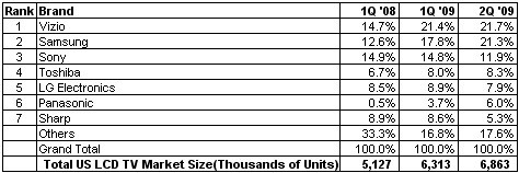 雖然三星奮起直追,但Vizio仍然連續(xù)第二個(gè)季度成為美國液晶電視市場(chǎng)霸主。