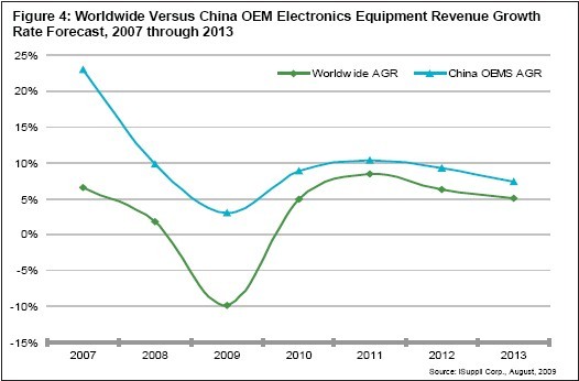 圖4所示為iSuppli公司對2007年至2013年全球以及中國OEM電子設(shè)備營業(yè)收入增長率的預(yù)測。