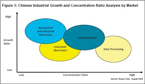 汽車與工業(yè)電子市場具有多樣化與分散化特點。但在中國,未來五年內(nèi),這兩個領(lǐng)域?qū)⑹撬袘?yīng)用領(lǐng)域中增長最快的。工業(yè)高速增長和制造業(yè)集約化程度低,為分銷商提供了許多商業(yè)機(jī)會。圖3所示為iSuppli公司對中國工業(yè)增長與集中程度的分析,按市場細(xì)分。