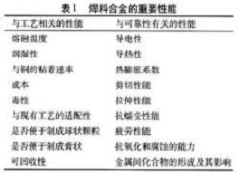 微電子領域使用的焊料有著很嚴格的性能要求,無鉛焊料也不例外,不僅包括電學和力學性能,還必須具有理想的熔融溫度。從制造工藝和可靠性兩方面考慮,表1列出了焊料合金的一些重要性能。