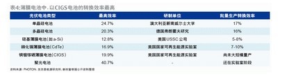 而光電轉換效率最低的硅基薄膜電池,由于性能不穩定,未來發展路徑主要依賴于技術的進步。在長城證券周濤看來,由于其主要原材料硅烷(SiH4)易于獲得,適合大規模生產,因此如果轉化效率能穩定在10%以上,將具備較強的競爭優勢。