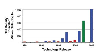 圖2顯示了Fairchild公司≤30V的N溝道MOSFET單元密度的進(jìn)步。每個(gè)條形都表示新的工藝進(jìn)步??梢钥吹?,在最近的十年中,單元密度從3200萬(wàn)單元/平方英寸增加到現(xiàn)在的10億單元/平方英寸。