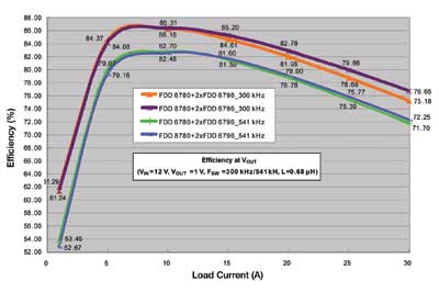 注意上面的兩條曲線,在滿載(30A)時(shí),可以看到最新的器件的效率有1.5%的改進(jìn)。同樣還是這兩條曲線,在負(fù)荷較?。?5A)時(shí),可以實(shí)現(xiàn)0.69%的改善。如果對(duì)整個(gè)負(fù)荷范圍積分,那么與今天常見(jiàn)的方案相比,使用最新的MOSFET器件時(shí)平均功率損耗可以降低8%~10%。即使在較高的開(kāi)關(guān)頻率541kHz處,可以看到在負(fù)荷小時(shí)系統(tǒng)級(jí)效率仍然高于80%,而在滿載時(shí)效率大于70%。如果頻率繼續(xù)增加,那么開(kāi)關(guān)損耗將急劇增加。