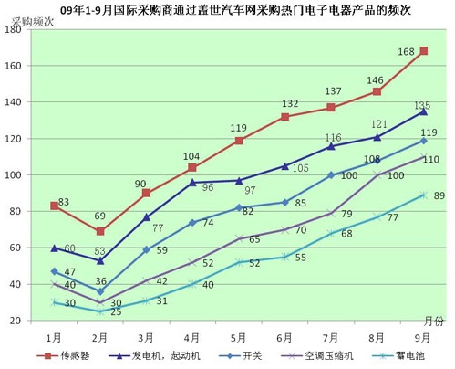 與此相對應,據全球領先的專業汽車零部件電子商務平臺—蓋世汽車網的統計數據顯示,09年2-9月,國際采購商通過蓋世汽車網采購的汽車電子電器產品均呈現出大幅度增長之勢(如下圖所示)。其中,熱門采購產品主要有傳感器、發電機/起動機、開關、空調壓縮機、蓄電池等,平均每月采購頻次分別為120、100、82、 68、54以上。與2月份相比,9月份熱門采購產品的采購量增長幅度均達2-3倍。