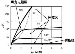 MOSFET的漏極導(dǎo)通特性與開關(guān)過(guò)程MOSFET的漏極導(dǎo)通特性如圖2所示。MOSFET與三極管一樣,當(dāng)MOSFET應(yīng)用于放大電路時(shí),通常要使用此曲線研究其放大特性。只是三極管使用的基極電流、集電極電流和放大倍數(shù),而MOSFET使用柵極電壓、漏極電流和跨導(dǎo)。