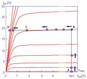 三極管有三個(gè)工作區(qū):截止區(qū)、放大區(qū)和飽和區(qū),MOSFET對(duì)應(yīng)是關(guān)斷區(qū)、恒流區(qū)和可變電阻區(qū)。注意:MOSFET恒流區(qū)有時(shí)也稱飽和區(qū)或放大區(qū)。當(dāng)驅(qū)動(dòng)開通脈沖加到MOSFET的G和S極時(shí),Vgs的電壓逐漸升高時(shí),MOSFET的開通軌跡A-B-C-D如圖3中的路線所示。