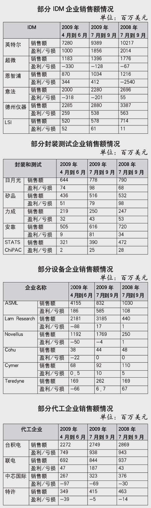 國際金融危機重創半導體業。今年第一季度企業產能利用率普遍在50%以下。進入第二季度后,我們看到部分企業業務止跌回升。近日,企業第三季度財報紛紛出籠,產業好轉趨勢進一步明朗化。但由于企業上升動力不足,產業出現“V型”反彈的可能性不大,應該會在振蕩中上升。與此同時,今年半導體業銷售額同比下降約15%的狀況已確定無疑。業內目前關注明年產業上升的幅度。