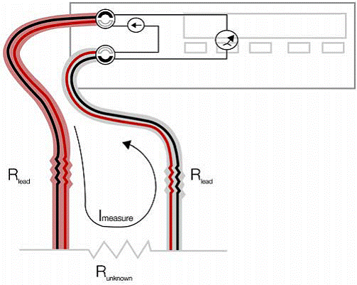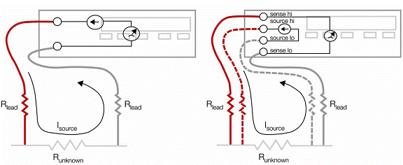 源端引線中的串聯(lián)電阻不影響電流流動。測量/傳感引線幾乎沒有電流流動,因?yàn)閮x表的輸入阻抗很高。這意味著測量引線中沒有IxR電壓下跌。因此,您只需測量由于流經(jīng)的源電流而在未知電阻器中產(chǎn)生的電壓下跌。
