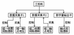 需要注意的是,當觸點電壓為交流信號時,為了保證電壓有效值的計算精度,采集卡在一個工頻周期內要完成16個采集通道至少320次的AD轉換,這就要求采集卡的采集速率非???,本裝置采用的是研華的PCL-818HG。每塊采集卡還提供了一個20-PIN數字輸出口,用來控制試品線圈回路的通斷電。試品觸點回路采用一塊多通道的數字量輸出卡,通過固態繼電器實現對兩組試品觸點回路的通斷電控制。繼電器可靠性檢測裝置的結構框圖如圖1所示。