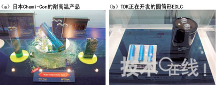 為了高效利用能源,EDLC重新獲得了重視。日本Chemi-Con展出了面向汽車的85℃型號開發品(a)。TDK參考展出了該公司首款大型圓筒形EDLC(b)。[page]