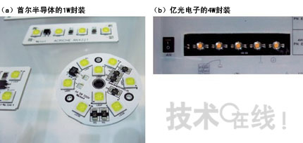 臺灣億光電子(Everlight Electronics)展出了其首款交流驅動封裝產品——功耗為1W和4W的樣品。這款封裝產品著眼于照明用途,首先將在臺灣和中國大陸上市。與上屆一樣,三墾電氣仍然展出了小型封裝產品。由于發光效率較低,設想的是電源分接頭等指示用途。