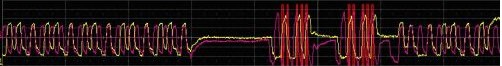 WaveScan會(huì)在左邊顯示的表格中列出每次捕獲中符合測(cè)量條件的所有波形特征。觸摸列表時(shí)會(huì)自動(dòng)的對(duì)被選擇的特征放大顯示。這個(gè)例子中顯示的是一組“寫(xiě)”操作狀態(tài)的縮放。每個(gè)符合測(cè)量標(biāo)準(zhǔn)的操作就像顯示出來(lái)的那樣用一個(gè)紅色方框描繪出輪廓。