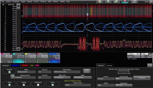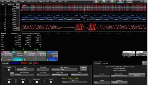 力科的WaveScan波形搜索與掃描特性可以通過(guò)選擇Strobe和掃描疊加(ScanOverlay)圖中滿(mǎn)足條件的波形之間的時(shí)序關(guān)系找出Data信號(hào)。圖2是這種功能的一個(gè)例子。WaveScan的對(duì)話(huà)框設(shè)置為搜索建立時(shí)間(Hold Time)在500ps到1ns(750 ±250 ps)之間的波形。對(duì)話(huà)框右邊的標(biāo)簽用來(lái)鑒別Strobe和Data信號(hào)。注意“Hold Clock”和“Hold Data”兩個(gè)對(duì)話(huà)框標(biāo)簽,測(cè)量是對(duì)這兩個(gè)信號(hào)邊沿設(shè)定的。