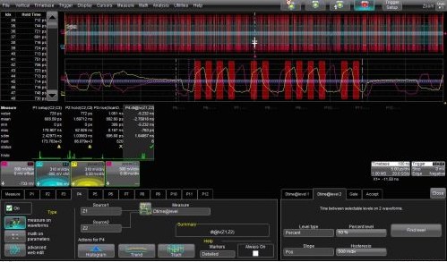 圖4顯示的是另一項(xiàng)測(cè)量技術(shù)。在這里,被選定的一組寫(xiě)周期用掃描縮放(ScanZoom)分離出來(lái)。參數(shù)門(mén)限進(jìn)一步隔離出僅有12個(gè)寫(xiě)周期并僅在信號(hào)正邊沿測(cè)量出兩個(gè)信號(hào)的時(shí)間差(P4)。WaveScan為您提供了一種可以測(cè)定DDR2設(shè)備的工具。