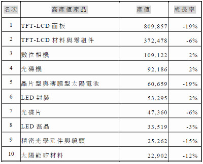 2009年臺灣地區1兆7,247億新臺幣的光電產值約相當522億美元,擁有16%的全球市場占有率。臺灣地區有幾項產品的世界占有率仍能維持全球前三大,包括LED芯片、LED封裝、TFT LCD材料與零組件、TFT LCD面板、數字相機代工、光驅與光盤片,和光學鏡片,以及結晶硅太陽電池等。與往年類似,這十大產品即占有臺灣地區整體光電產值的94%比例。