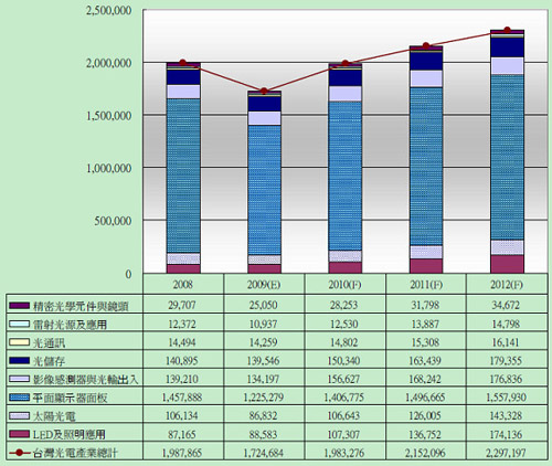 根據光電科技工業協進會(PIDA)的分析,2009年全球光電市場持續受到全球金融風暴的影響,又從2008年的4,220億美元,大幅衰退了23%,跌到3,235億美元,可謂創下有史以來最大的跌幅;更甚于1997年的亞洲金融風暴和2000年的通訊市場泡沫化。預期全球光電市場將會于2010年反彈,成長16%;亦高于以往的成長率,然后再以10%左右逐年回升。