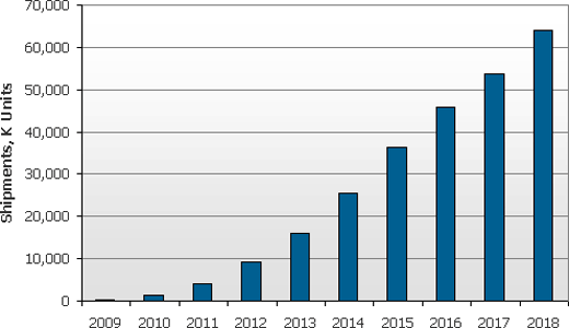 - 3D TV將由2009年的20萬臺成長到2018年的640萬臺
