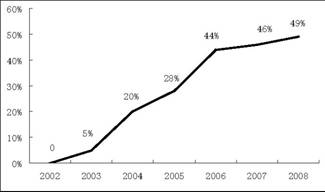 自2003年啟動半導體照明工程和“十一五”863重大項目實施以來,我國LED外延材料、芯片制造、器件封裝、熒光粉等方面均已顯現具有自主技術產權的單元技術,部分核心技術具有原創性,初步形成了從上游材料、中游芯片制備、下游器件封裝及集成應用的比較完整的研發與產業體系,為我國LED產業做大做強在一定程度上奠定了基礎。目前我國芯片企業產業化線上完成的功率型芯片封裝后光效超過90lm/W。具有自主知識產權的功率型硅襯底led芯片封裝后光效達到78lm/W,處于國際先進水平。根據國家半導體照明工程研發及產業聯盟統計,從2004年開始國內LED產業累計新增投資規模達150億元,最近連續3年,每年企業訂購并安裝投入的MOCVD數量超過50臺以上,國產化率大幅提高,截止2008年底,芯片國產化率達到49%(見圖1)。按照目前聯盟成員單位的擴產計劃和機臺訂單數量,預計未來3年國內將增加MOCVD近兩百臺。目前Cree、旭明以及臺灣芯片廠商都以合資的形式進入了國內,勢必進一步帶動芯片的國產化。2015年芯片國產化率有可能達到70%。