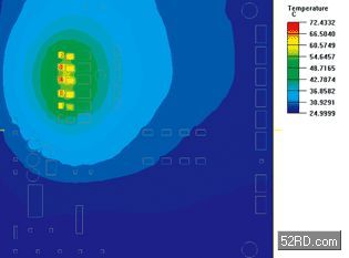 在圖1b中,高溫代表了低的熱導率,低溫代表了高的熱導率。從圖中可以看出,在沒有走線的區域溫度較高,在走線較多的區域溫度較低。在有大過孔的區域,溫度接近45℃。
