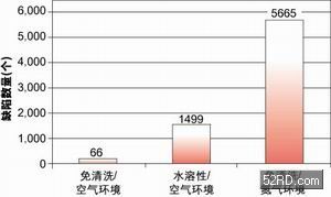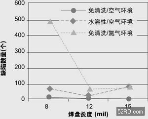 圖1顯示出三種不同組裝工藝的良品率情況。由圖可見,使用免清洗焊膏在空氣環(huán)境下進(jìn)行回流焊產(chǎn)生的不良最少,總數(shù)為66個(gè);使用水溶性焊膏在空氣環(huán)境下進(jìn)行回流焊次之,不良有1,499個(gè);使用免清洗型焊膏在充氮環(huán)境下進(jìn)行回流焊產(chǎn)生的不良數(shù)最多,為5,665個(gè)。圖3還表明在充氮環(huán)境下以及焊膏助焊成分活性增大(水溶性焊膏)時(shí),產(chǎn)生的不良數(shù)目會(huì)增多。