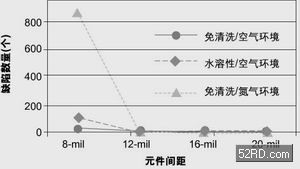 圖2是三種不同組裝工藝中錫橋與元件間隔之間的關(guān)系。從圖中看出,元件間隔在0.012英寸或更大時(shí)沒有發(fā)生任何錫橋。免清洗焊膏在空氣環(huán)境中焊接產(chǎn)生的錫橋數(shù)量最少,為14個(gè);水溶性焊膏在空氣環(huán)境中焊接產(chǎn)生的橋接數(shù)量排在第二,為99個(gè);而免清洗焊膏在充氮環(huán)境中焊接產(chǎn)生的橋接數(shù)量最多,有866個(gè)。此外在最小的0.008英寸間距下,用免清洗焊膏在空氣環(huán)境焊接時(shí)18種焊盤中有12種焊盤沒有產(chǎn)生任何錫橋,用水溶性焊膏在空氣環(huán)境中焊接時(shí)有10種焊盤沒有錫橋,而使用免清洗焊膏在充氮環(huán)境中焊接時(shí)只有6種焊盤沒有產(chǎn)生錫橋。