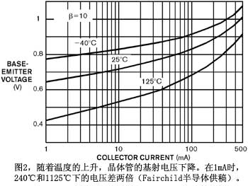 熱與冷都會對電路造成負面影響。在極高溫下,芯片可能燒毀(圖1)。更常見的情況是,如果你的設計達到未曾預料的溫度,很多部件都可能超出規定極限。當出現這種情況時,電路就可能表現出難以預料的行為。另外一個情況也同樣值得關注,即電路溫度從熱到冷,然后又從冷到熱。這種狀況會造成熱沖擊,也會毀壞元件。很多工程師并不關心自己的電路在低溫下的性能,但這種忽視是一個錯誤。半導體器件的性能在低溫下會發生顯著變化。雙極晶體管的基射結電壓在低溫下會大大升高(圖2和參考文獻1)。AnalogDevices產品開發工程經理FranciscoSantos說:“如果你要設計一個能夠在負溫度下工作于1.8V的放大器,就要考慮當從室溫降到-40℃時,VBE(基射電壓)會增加130mV。這種情況將迫使設計者采用一組完全不同的放大器架構。”