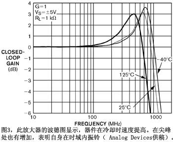 很多放大器,如AnalogDevices的AD8045,在冷卻時會加速(圖3),而有些放大器(如AD8099)則在變冷時會降速。已退休的LinearTechnology信號處理產品前副總裁兼總經理BillGross稱:“雙極晶體管在低溫下遇到的多數麻煩是低電壓工作。”他認為,較高的基射電壓和較小的電流增益都更難于滿足規格要求。他說:“較低的輸入阻抗和b(電流增益)的不匹配都會造成低溫下的大問題。尤其是當它們為室溫運行作了調整時。較高的gm(跨導)很容易通過改變工作電流而得到補償,但這樣的話轉換速率就會變化。”