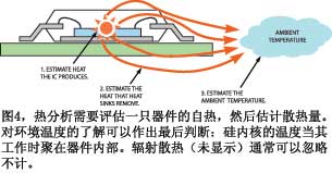 電路的熱分析分三個步驟。首先估計IC中產生的熱量。然后,估計電路板或散熱片散掉的熱量。最后,估計部件將要運行的環境溫度(圖4)。在估計元件產生的熱量時,DC分析通常沒什么價值。一只電壓為1V、流過1A電流的電阻器,會產生1W的熱量。但是,要估計交流或未確定的信號所產生的熱量就比較麻煩。首先,從電源端到接地腳的靜態電流總是在耗散一個直流功率。一個采用10V電源和5mA靜態