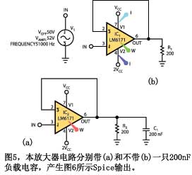 如果你能確定IC通過信號的特性,就可以用Spice來估算功耗。此時必須保證使用恰當的Spice模型,它們對一些測試信號給出合理的結果,而功耗計算此時沒有價值。圖5表示一個Spice圖。芯片的功耗不同于到達負載的功率。圖6是圖5示意圖的Spice曲線圖。它以紅線表示啟動的振蕩。電路是否會發生這種振蕩只是個人的猜測,但它應該會使你在建立原型后查看這種行為。記住,在OrcadCapture上點擊W鍵只能顯示芯片的靜態功耗。要獲得工作時的功耗,要用示意圖上的功率標記,然后用曲線程序的rms-math函數,給出器件的平均功耗。