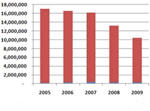 雖然近5年美國新車(指輕型汽車,下同)銷量逐年下滑(見圖1),但混合動力汽車這一最早規模化生產的“新能源汽車”的銷量在2008年之前基本是呈逐年增長態勢,2008、2009年因為美國汽車整體需求下降及由此導致的油價回落等因素導致美國混合動力汽車銷量出現同比下滑。