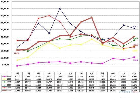 其中,2009年銷量在2008年的基礎上下降了7.5%,至29.03萬輛(數據來源為Green Car Congress,下同)。2005-2009年各月美國混合動力汽車銷量,詳見圖2。