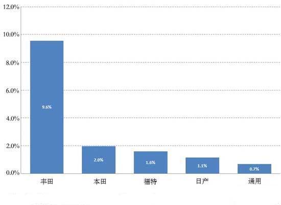 圖4:2009年12月車企在美國的混合動力汽車銷量占輕型汽車新車總銷量的比重